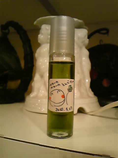 写真は、ホホバオイル10mlに希釈したものです。ホホバの黄色とジャーマンのブルーが混ざってきれいなグリーンになりました♪