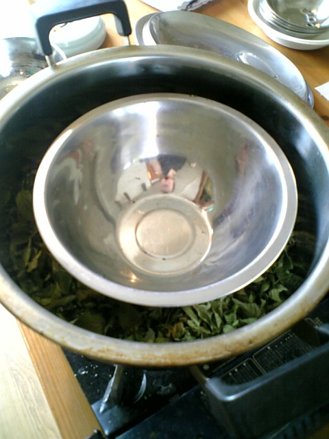 ② なべに水とハーブを入れ、一回り小さいボウルを置く