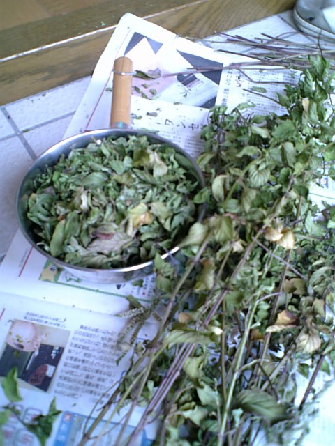 ①ミント、ペパーミント、まぜこぜで葉っぱだけをとり、手でパリパリと小さくする