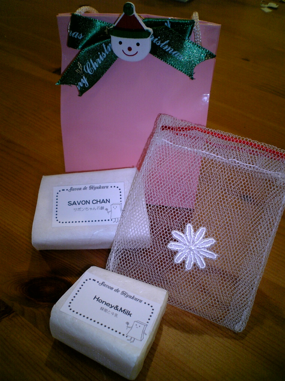 ミニせっけん2種類 (各20~40g) と ホイッピングネットのセット をクリスマス用ギフトバッグに入れて…