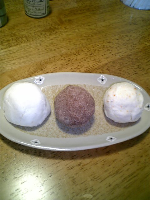 これらがあればうっすら水分足して、丸めると出来上がります。一応アロマ屋としては、ここに香りをプラスさせますが…。あと、アレンジも楽しいのでいろいろやってみました!