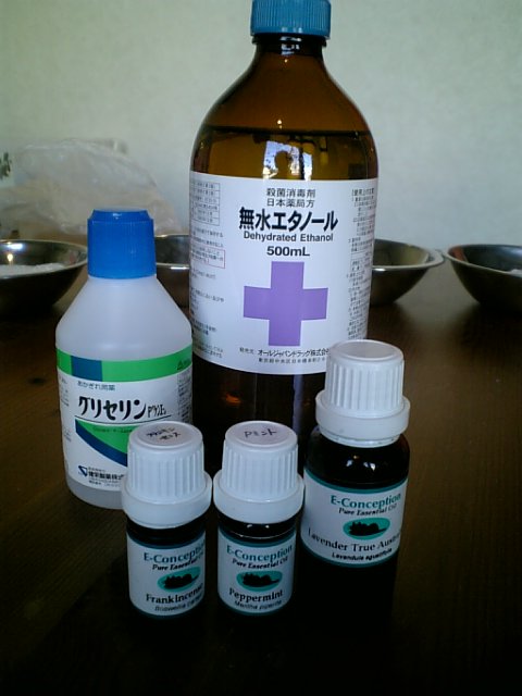 グリセリン、無水エタノール(なくてもよい)、精製水、精油