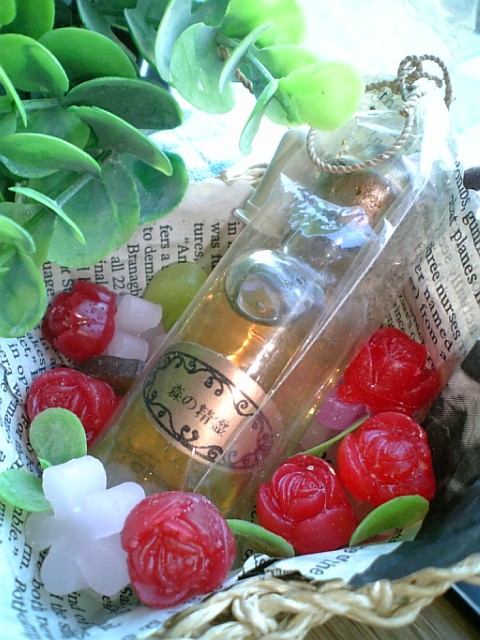 ひゅうくるでは、視覚的にも楽しんでもらえるように小さなかごに、花の香りのキャンドルと一緒に詰めました(スポイト付)